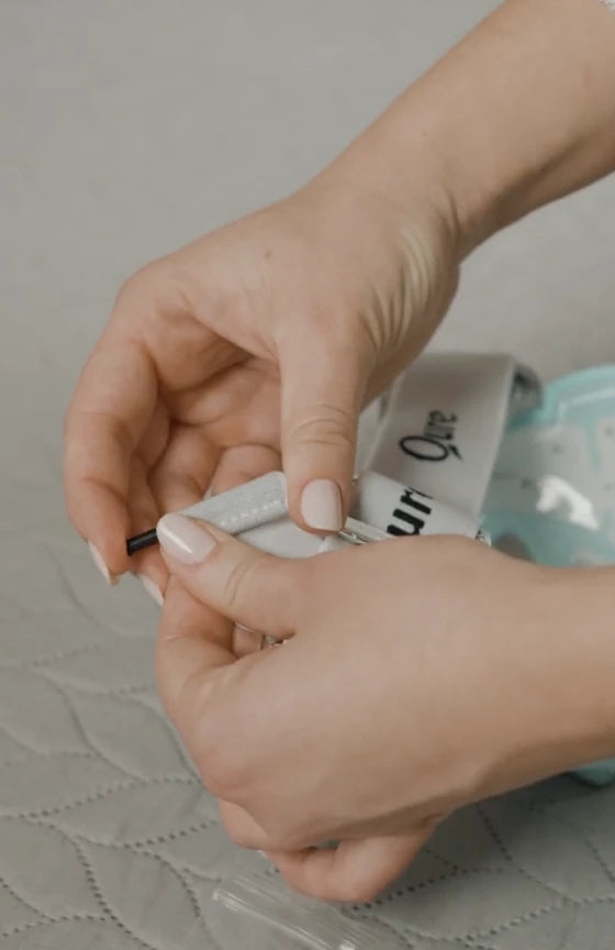 With the logos facing down, slide the strap into the first clip. Loop the strap through the adjustor and second clip.